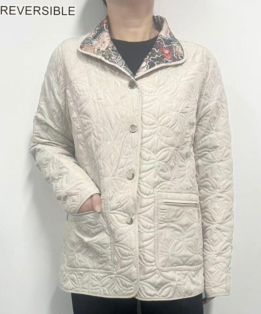 This lightweight quilted jacket features a reversible design, showcasing an elegant floral pattern on one side and a cream white finish on the reverse. It includes a snap front closure and convenient slash pockets for added functionality.